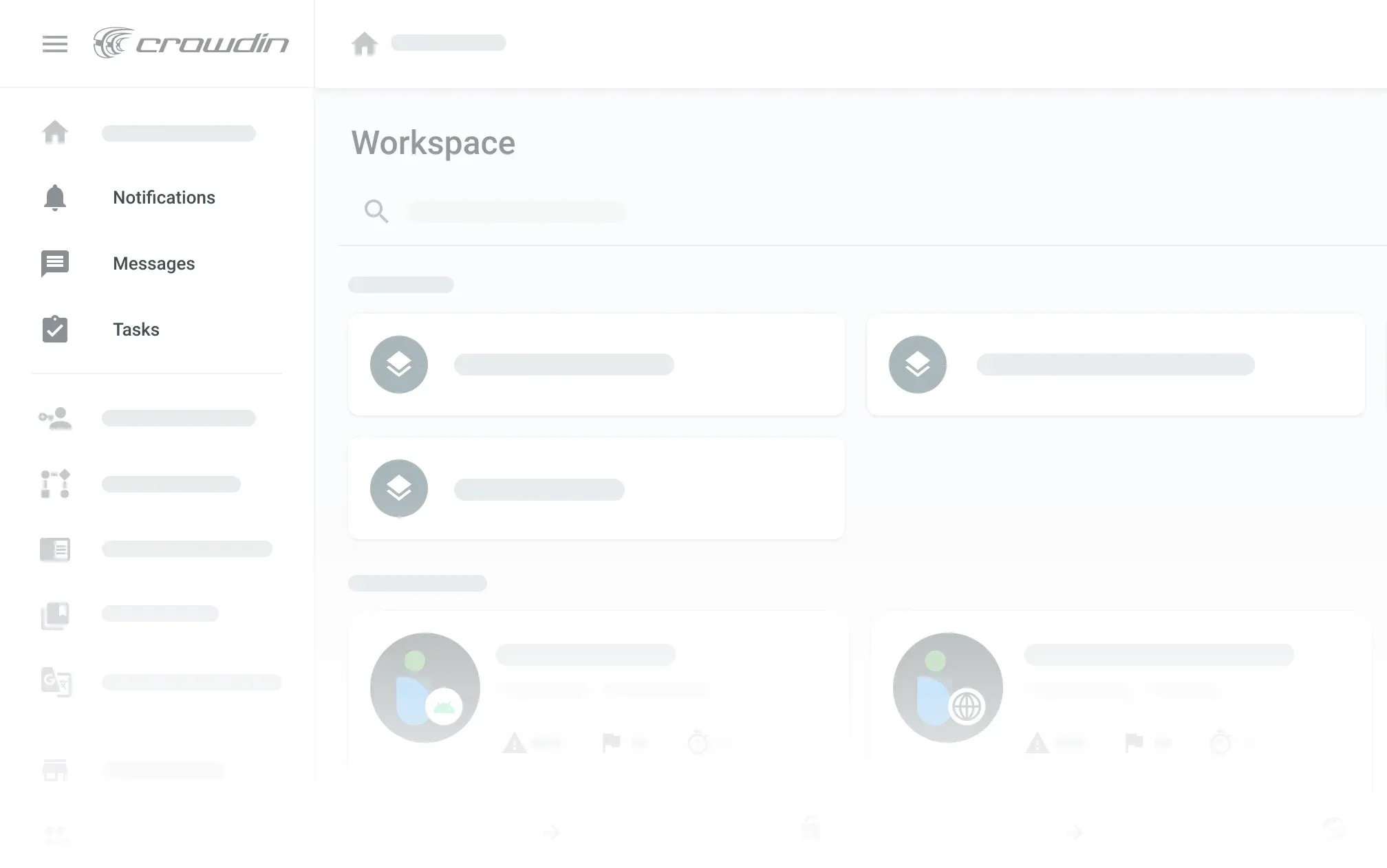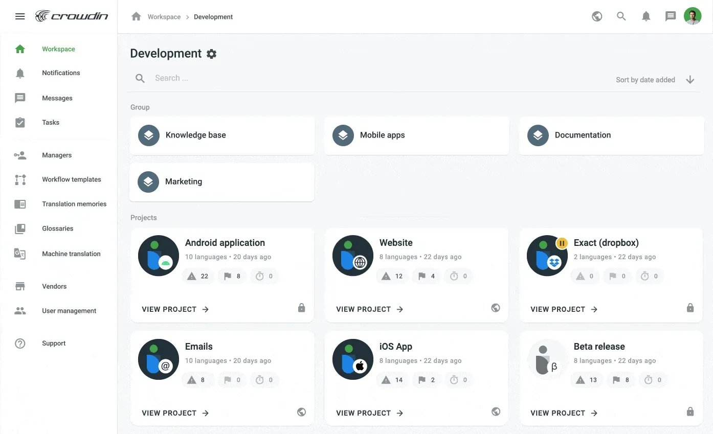 We start with the Workspace, a place where every localization puzzle is brought together. It’s a place where you create and get access to all projects, groups, and localization resources, where you invite vendors, grant accesses, and manage permissions. The UI of the new workspace is designed to give you a clear vision of what’s going on within your organization and quickly access all the things you might want to check, customize, or control.