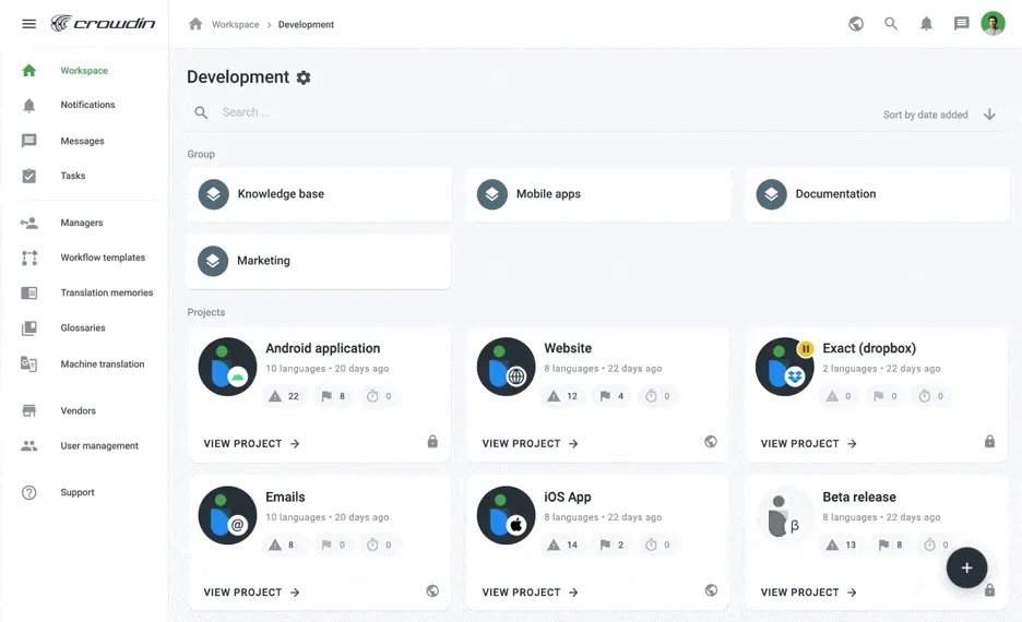 Depending on the tab or section you’re currently on, the + button will help you create or add something new. Be it a project or group, a new glossary, or a workflow template. It also helps you invite a new vendor or a manger to the organization or group, and more. Every time you need to start something new, remember there’s this little helper in the lower right corner.